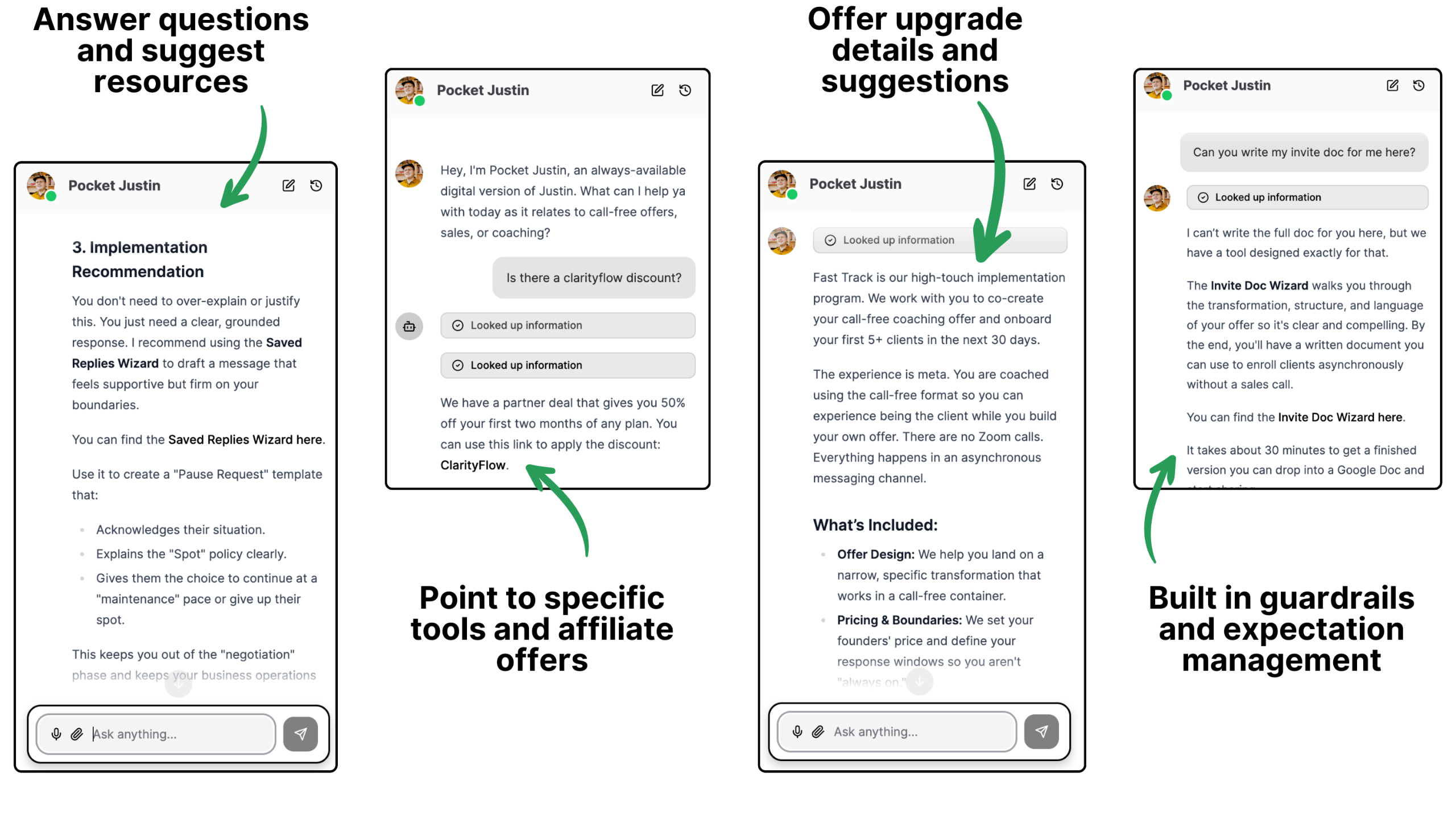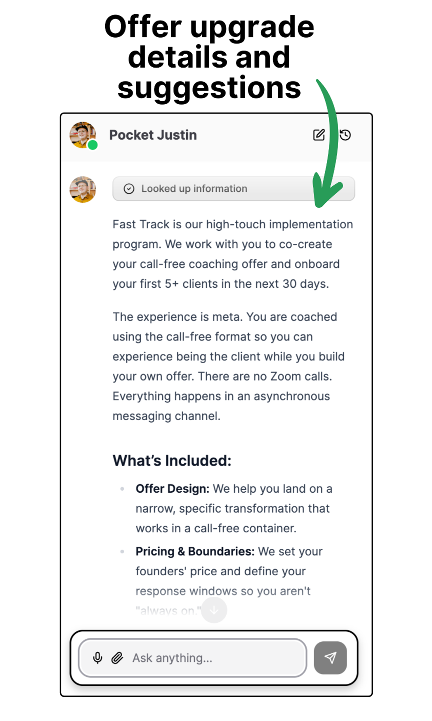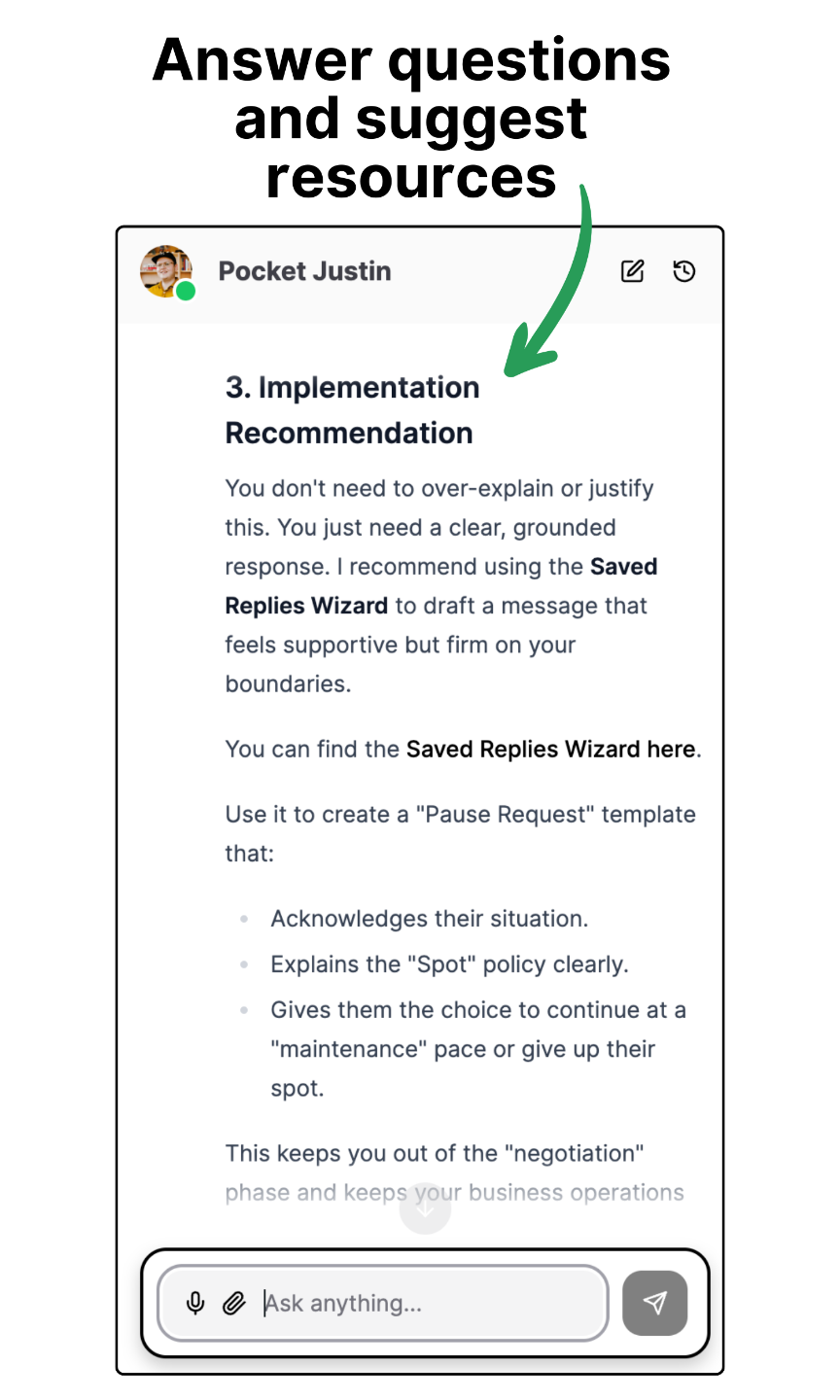 Pocket Justin (our own always available AI Coach Companion) helps our clients make progress, find relevant resources, and more.